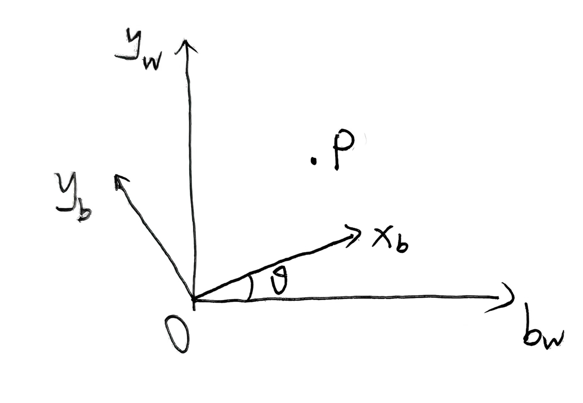 如图所示,两坐标系的关系就是汽车坐标系相对于世界坐标系旋转了$\theta$,不变的量是$\overrightarrow{OP}$都一样,变的是$P$在两个坐标系下的坐标不一样了,因为两个坐标系的基底不一样了。